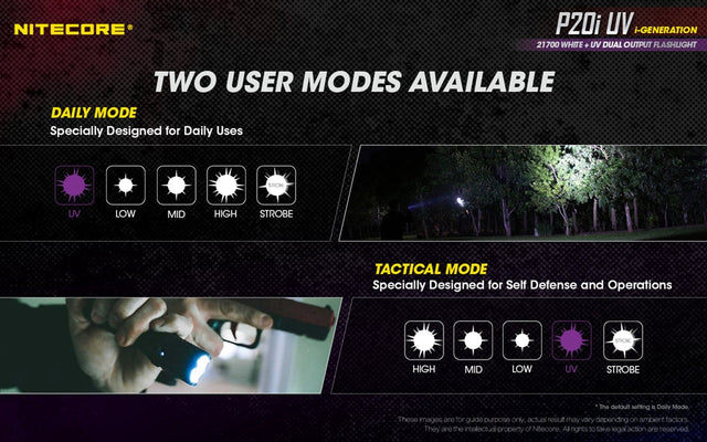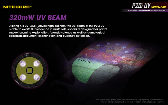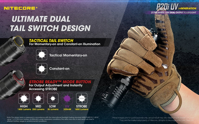 The NITECORE P20i UV is the ultimate high performance tactical flashlight, designed for law enforcement and military personnels, It emits up to 1800 lumens with a max throw of 368 yards along with a 320mW UV light. The UV beam illuminates fluorescence in materials, specially designed for patrol inspection, forensic science, and currency detection. Non-linear strobe patterns cause enhanced dizzying effects, highly effective for diffusing a tense situation.